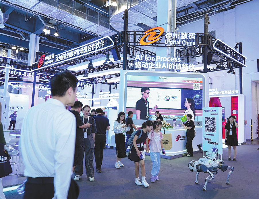 Посетителите проверяват продуктите на Digital China на щанда на компанията по време на Световната AI конференция 2025 в Шанхай през юли. CHINA DAILY
