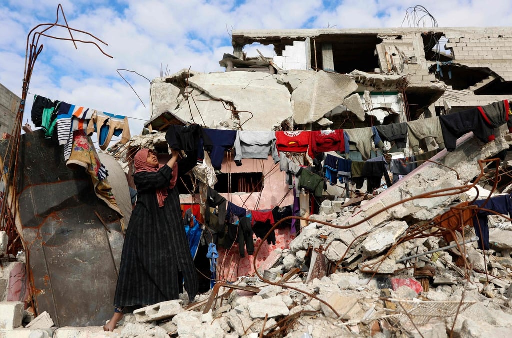 Разселен палестинец разнася пране в бежанския лагер Джабалия, северната част на Ивицата Газа, в събота. Снимка: AFP
