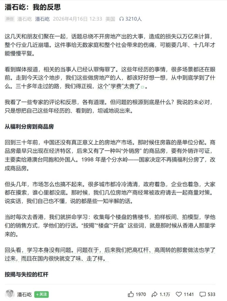Екранна снимка на изтритата публикация в WeChat от Pan Shiyi. Пан, който се издигна от скромно начало до съосновател на SOHO China – един от водещите предприемачи на търговски имоти в страната – през 90-те години, стана видна фигура по време на бума на имотите в Китай. Той живее в САЩ от 2022 г., когато секторът беше в разгара на криза и Пекин беше политики за затягане да се справи с високата зависимост на разработчиците от дълга за растеж.
