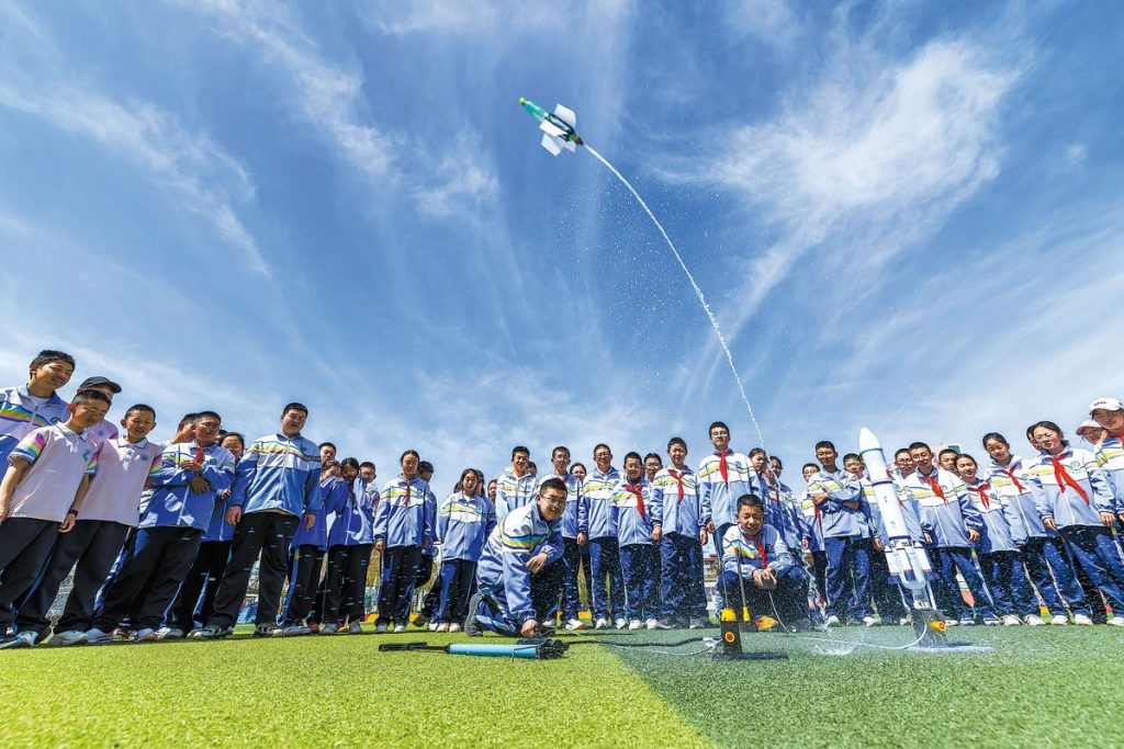 Ученици в средно училище в Zhangye, провинция Gansu, експериментират с ракети с водно гориво в петък, който отбеляза 11-ия Ден на космоса в Китай. [YANG XIAO / FOR CHINA DAILY]