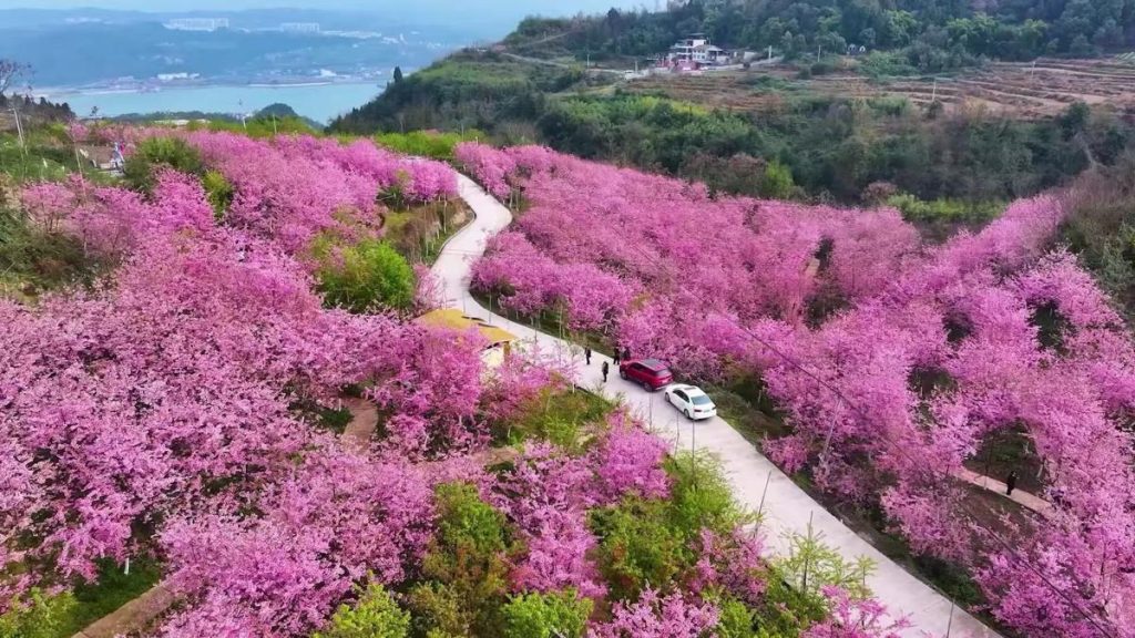 Градина с над 66 хектара черешови цветове в окръг Zhongxian, Чунцин в Югозападен Китай — благодарение на покачващите се температури през пролетта — наскоро разцъфна, привличайки множество посетители с живите си цветове и възхитителен аромат, нетърпеливи да се насладят на живописната сцена.