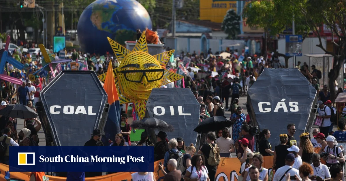 Хиляди хора маршируваха по улиците на Белем в събота, за да настояват за действие от преговарящите, които водят тежки преговори на климатичната конференция на ООН Cop30 в амазонския град. Под напичащото слънце коренното население, смесено с активисти, се събра в празнична атмосфера, пускайки музика от високоговорителите, носейки огромна плажна топка на Земята и държайки знаме…