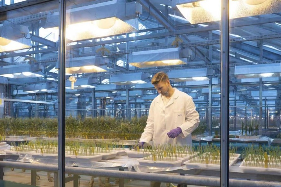 Изследовател от Syngenta Group проверява растежа на културите в оранжерия в центъра за изследване и развитие на компанията в Щайн, Швейцария. [Photo provided to chinadaily.com.cn]